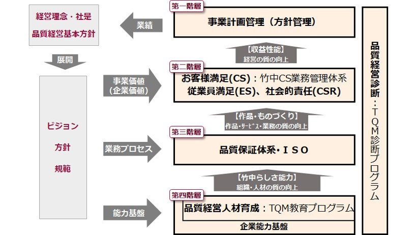 「竹中品質経営(TQM)」は、企業活動全体の質の向上を目的に、企業活動を「事業計画管理(方針管理)」「お客様満足(CS)、従業員満足(ES)、社会的責任(CSR)」「品質保証体系・ISO」「企業能力基盤」の四階層に構造化し、企業理念のもとで健全に機能させ、将来にわたって品質経営で社会に貢献し続けるための企業メカニズムです。